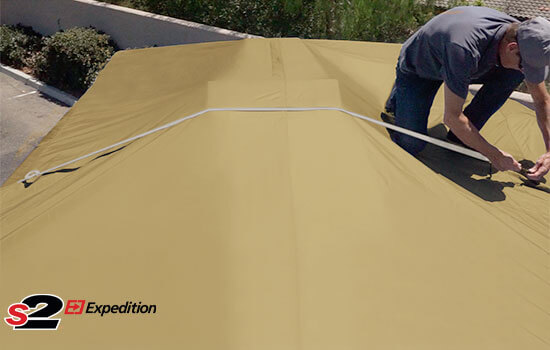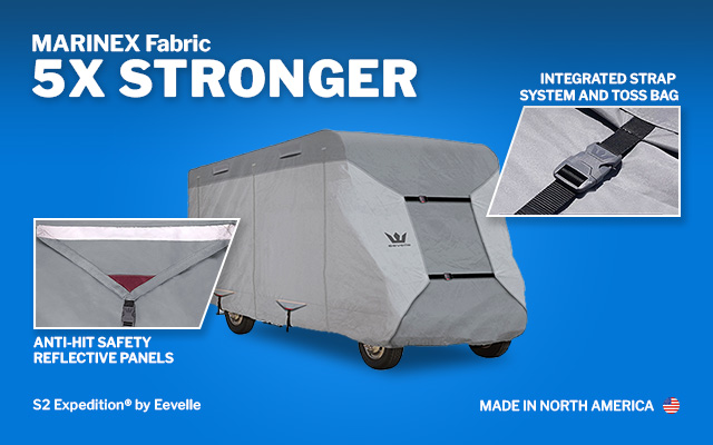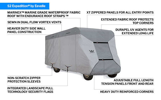 S2 Expedition class C RV covers specialize in a snug, custom-like fit with adjustable full-length panels in the front and rear. Important details like extended fabric roof protects the top corners from tearing. The S2 features a Marinex marine grade waterproof fabric roof and heavy-duty sidewall construction. Two-foot increment sizing vs. three-foot gives the S2 camper cover that custom look and feel.