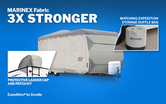 S2 Expedition travel trailer covers specialize in a snug, custom-like fit with adjustable full-length panels in the front and rear. Important details like extended fabric roof protects the top corners from tearing. The S2 features a Marinex marine grade waterproof fabric roof and heavy-duty sidewall construction. Two-foot increment sizing vs. three-foot gives the S2 camper cover that custom look and feel.
