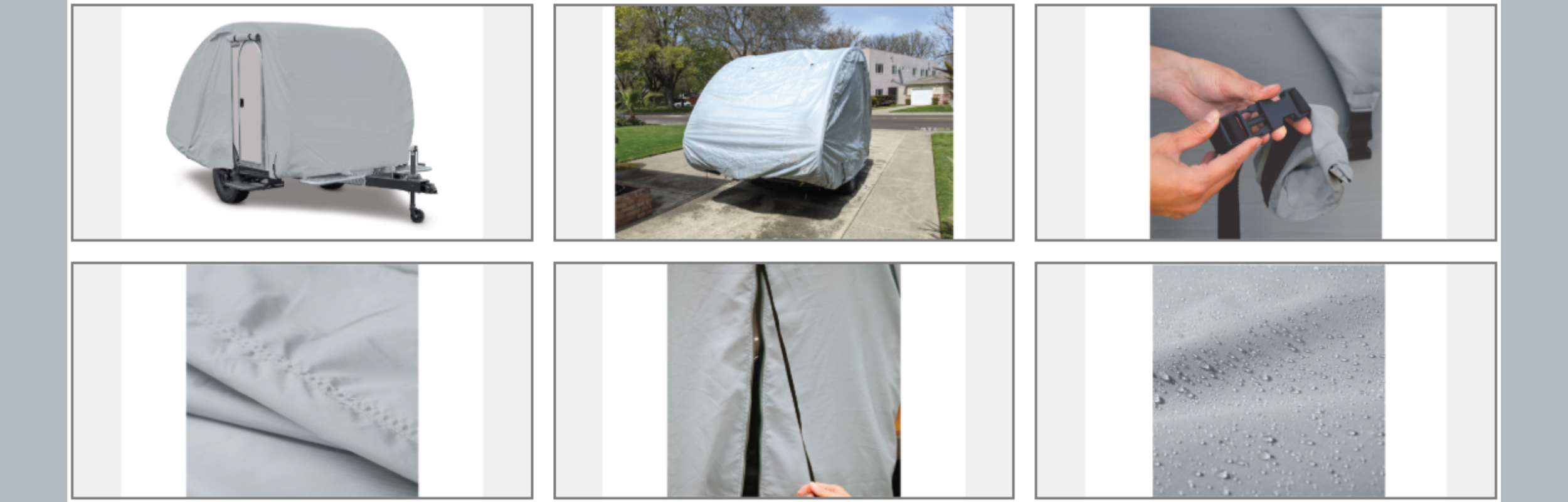 We tried the teardrop cover on several different RVs and confirmed that the material feels just as nice and strong as the manufacturer claims. The fit is very snug and it's easy to get the cover tight using the strap system at the front. It's also convenient to have zippers around the cover that allow easy access in and out of the RV without ever having to take off the cover. Great heat reflective for those hot days.
